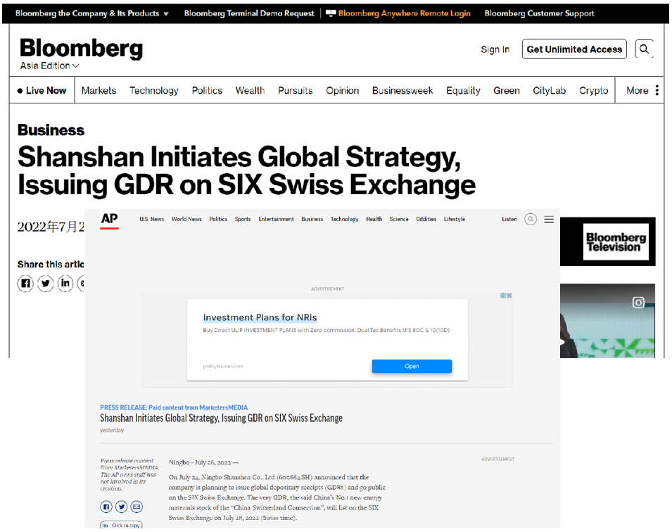 彭博社指出,杉杉股份成功申請發行GDR并在瑞士證券交易所上市,是中國新能源產業首批“中瑞通”,對于進一步拓寬海外融資渠道,開拓海外市場,實現全球化戰略,極具創新意義。
