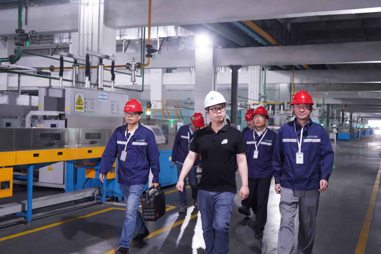 鄭駒深入車間了解產線建設、工藝流程。眉山基地負責人匯報各產線投產進度及下半年生產經營目標。