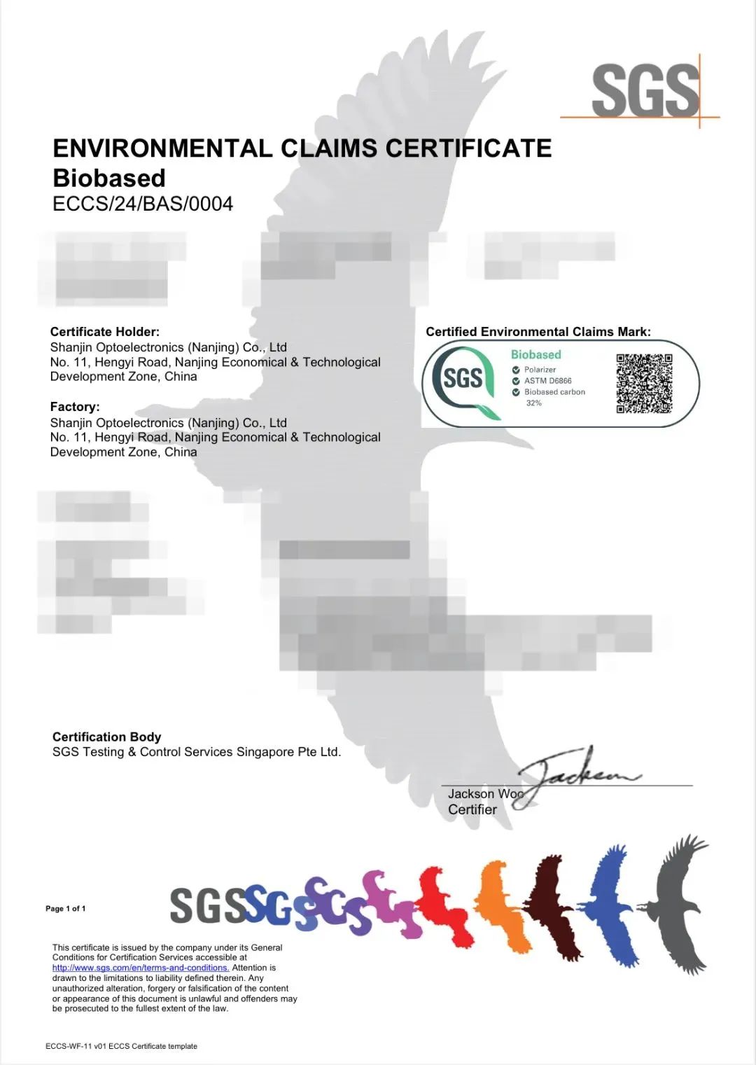 杉金光電始終把綠色理念貫穿于產(chǎn)品研發(fā)、生產(chǎn)和銷售的各個環(huán)節(jié)。此次,公司自主研發(fā)的“Eco-Friendly Polarizer”產(chǎn)品憑借其高達32%的生物基碳含量,在環(huán)保領域取得了重大突破。這一創(chuàng)新產(chǎn)品的推出,不僅滿足了市場對綠色環(huán)保產(chǎn)品的迫切需求,也增強了公司對ESG的承諾和在綠色產(chǎn)品開發(fā)領域的領先地位。