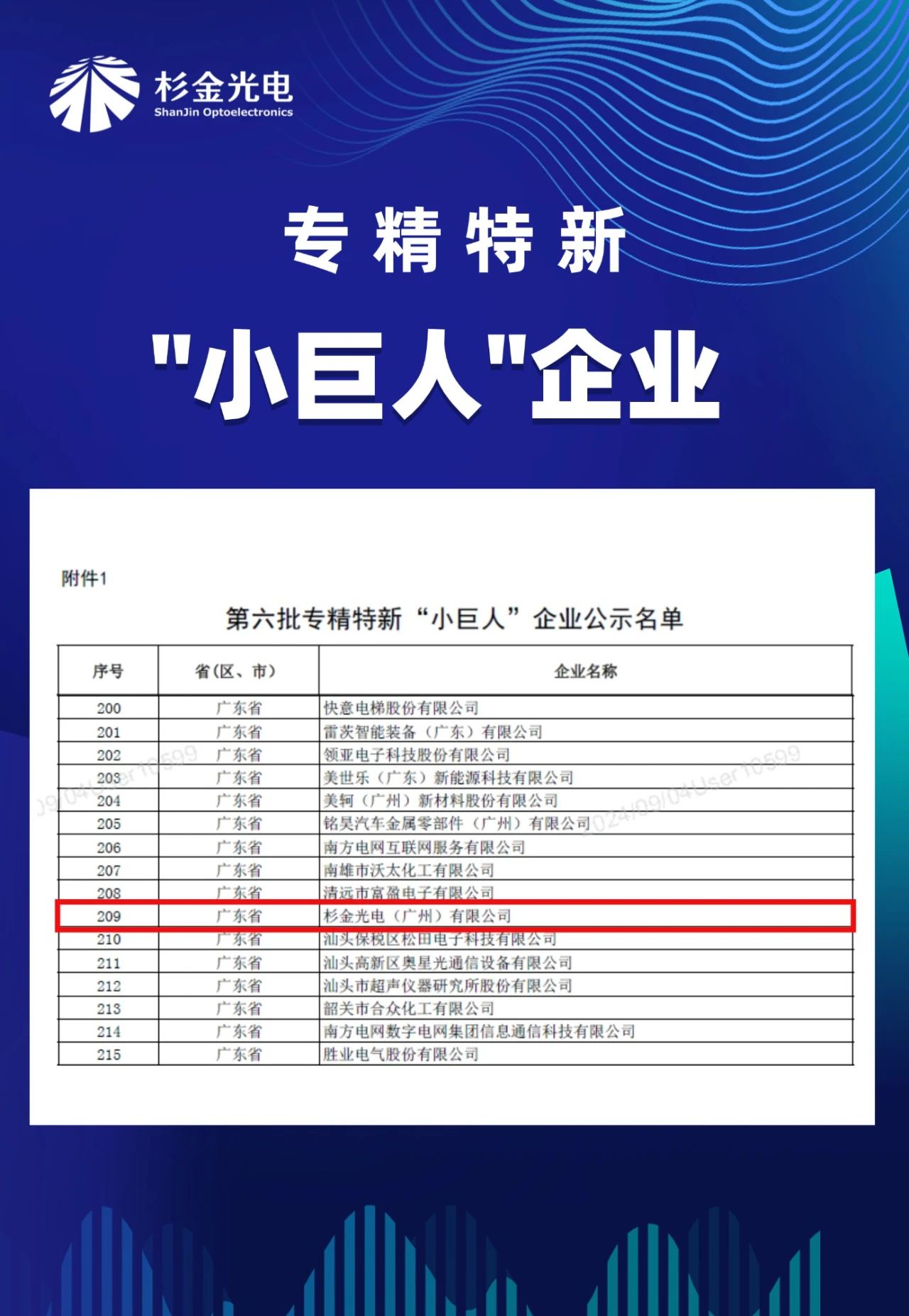 近日,廣東省工業和信息化廳公示了最新一批專精特新“小巨人”企業名單,杉金光電廣州公司榮列其中。
