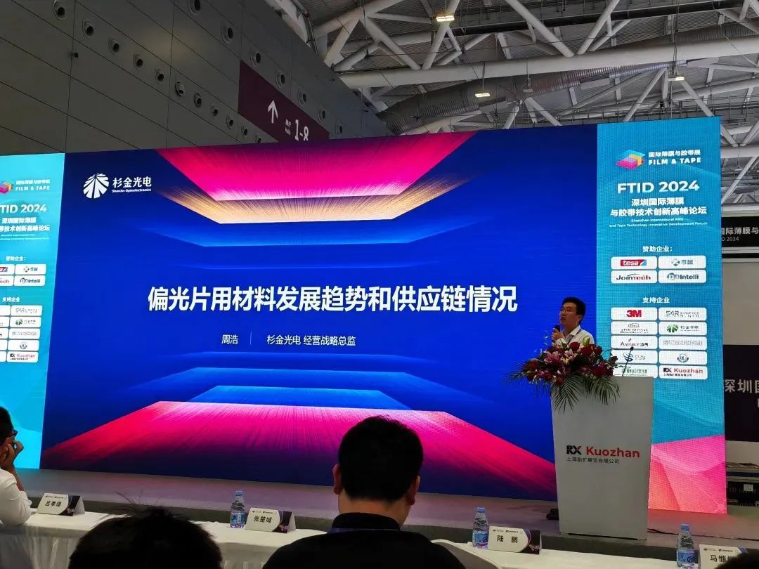 11 月 6 日,在同期舉辦的 2024 深圳國際薄膜與膠帶技術創新發展高峰論壇上,杉金光電經營戰略總監周浩發表了主題為《偏光片材料的發展趨勢與供應鏈情況》的報告。報告對顯示及偏光片產業發展趨勢、偏光片產業技術發展趨勢、偏光片用材料需求以及偏光片用材料供應鏈情況進行了深入總結。