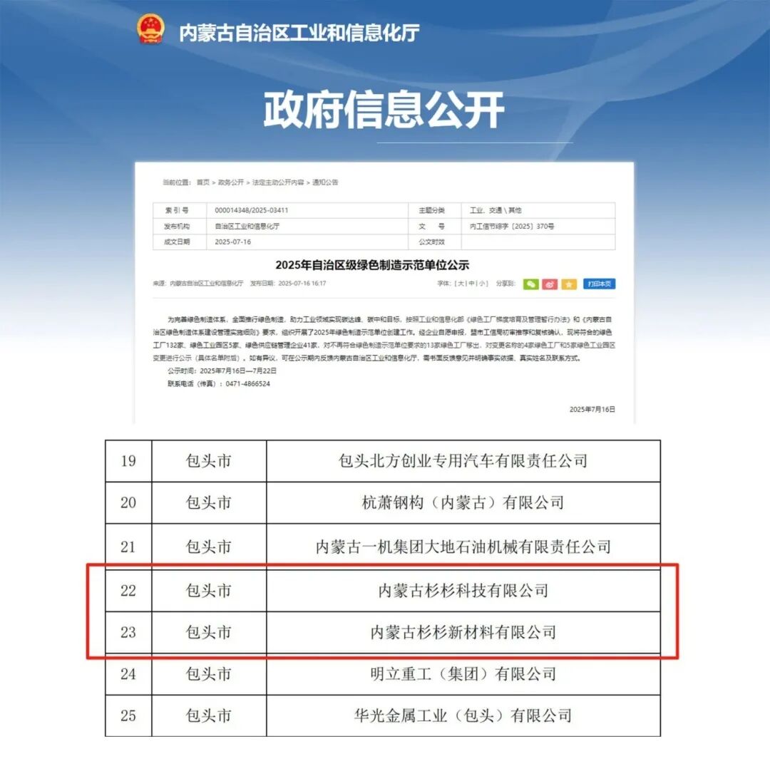 2025年7月16日,經內蒙古自治區工業和信息化廳發布《2025年自治區級綠色制造示范單位公示》,內蒙古杉杉科技有限公司(青山工廠)及內蒙古杉杉新材料有限公司(九原工廠)雙雙獲評內蒙古自治區級“綠色工廠”,使杉杉省級以上綠色工廠再“+2”。