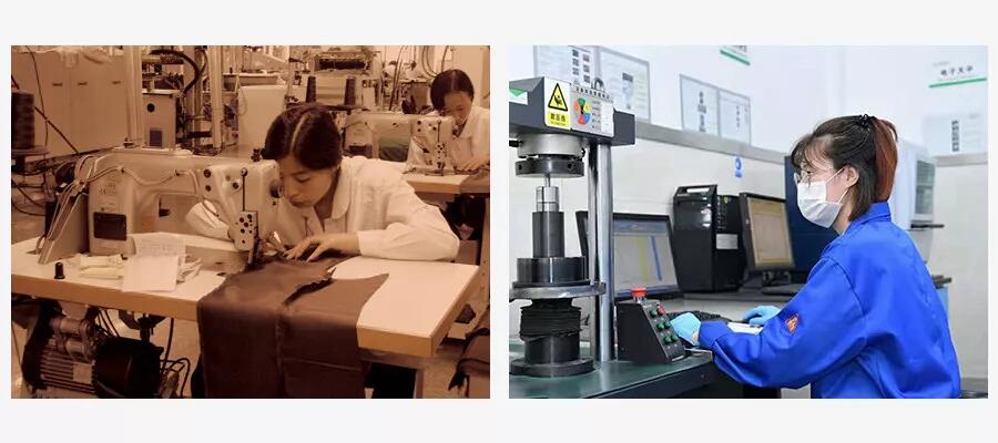 左圖:1998年女員工在傳統縫紉機前埋頭苦干   右圖:2019年技術人員在精密設備前從容操作